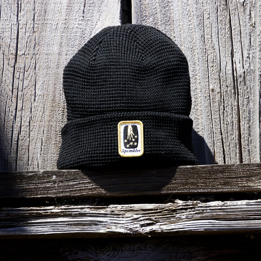 Waffle pattern beanie with sprinkle dust logo patch.